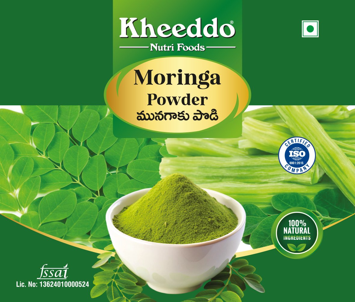 Kheeddo Nutri foods Moringa Powder is a rich source of antioxidants , proteins, essential vitamins and minerals. Organically sourced 100% natural fresh Moringa ( Munagaku) leaves are carefully harvested, Cleaned , sun dried, and powdered to preserve their rich nutritional profile.